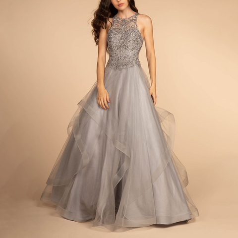 OEM/ODM derin o-boyun gri resmi saten dantel dekorasyon kabarık tül boncuk kadınlar için nefes tasarım abiye
